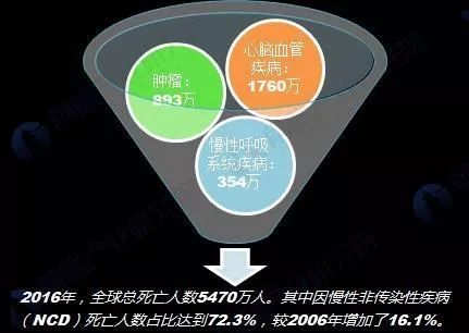根據(jù)2016全球疾病負擔(dān)研究(Global Burdenof Disease Study 2016,GBD)公布的數(shù)據(jù)顯示,2016年全球總死亡人數(shù)為5470萬人,其中死于慢性非傳染性疾病(NCD)人數(shù)占比達到72.3%,總?cè)藬?shù)為4004萬人。2016年慢性非傳染性疾病(NCD)死亡人數(shù)較2006年增加了16.1%。 2016年,造成最多死亡人數(shù)的三類死因為:心腦血管疾病-1760萬;腫瘤-893萬;慢性呼吸系統(tǒng)疾病-354萬。